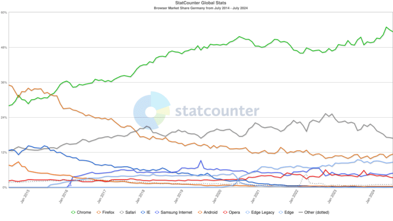Die Browsernutzung in Deutschland zeigt, dass Google Chrome führend ist. Die folgende Grafik veranschaulicht die Entwicklung der Browsernutzung in den letzten 10 Jahren:
